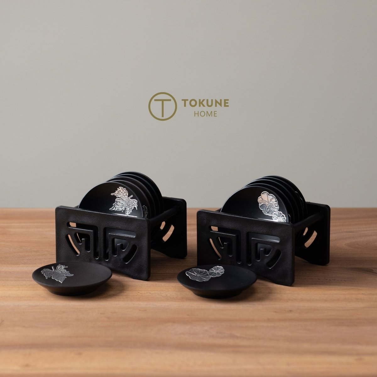 デザインは葡萄の葉と朝顔の葉の2種類があり、それぞれ6枚入りで専用ホルダー付き。日常のティータイムを格上げするだけでなく、来客時のおもてなしにもぴったりです。シンプルでありながら上質な存在感を放つこのコースターセットは、ギフトや特別な日の贈り物にも最適な逸品です。