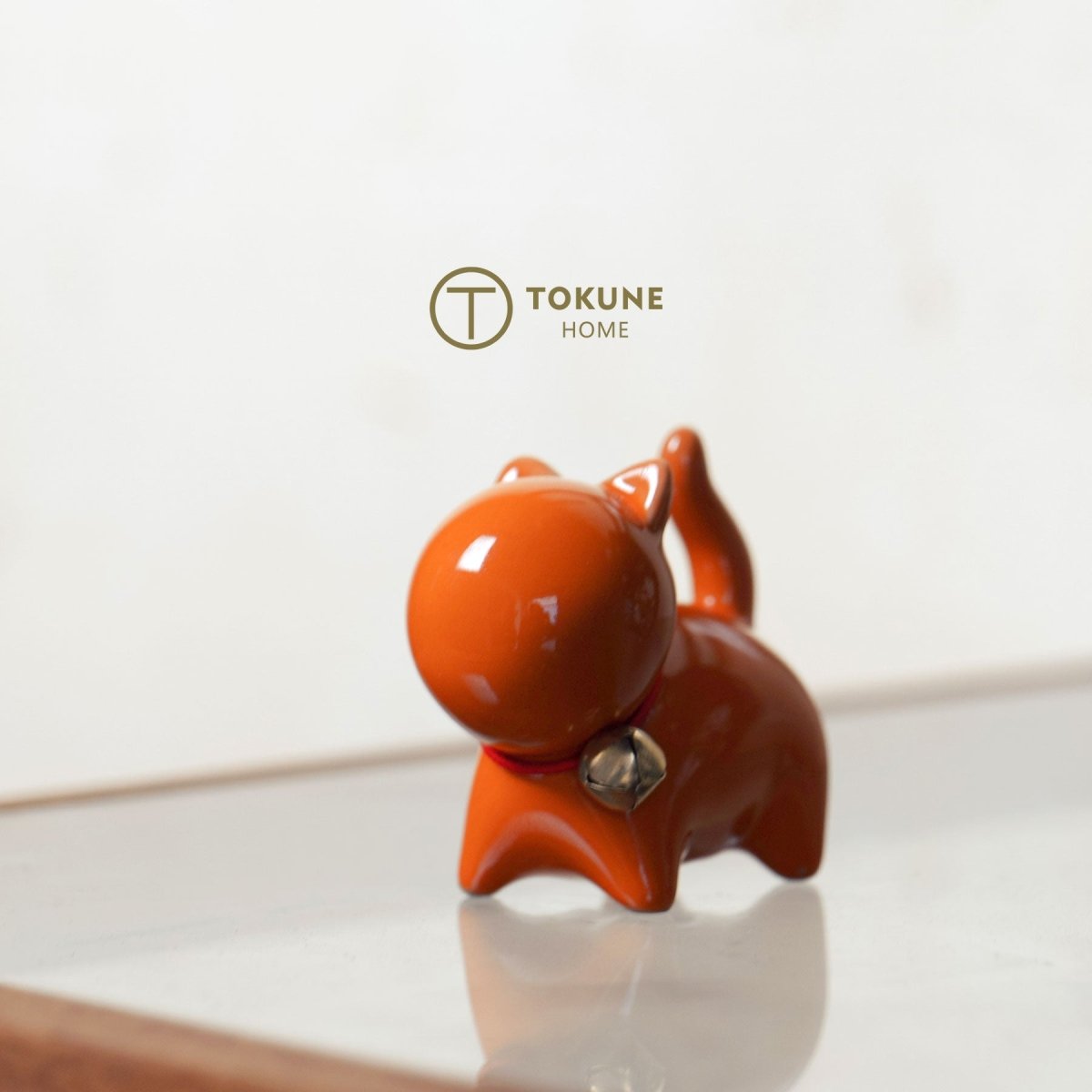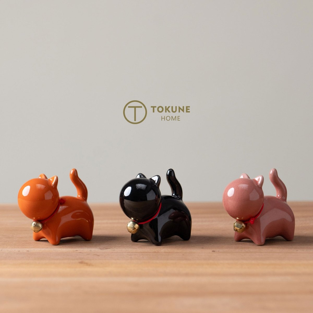 オレンジとピンクの猫を玄関に飾っています。首元の小さな鈴が揺れるたびに優しい音色がして、とても癒やされます。手作り感があり、同じ色でも表情が少しずつ違うのが魅力です。
