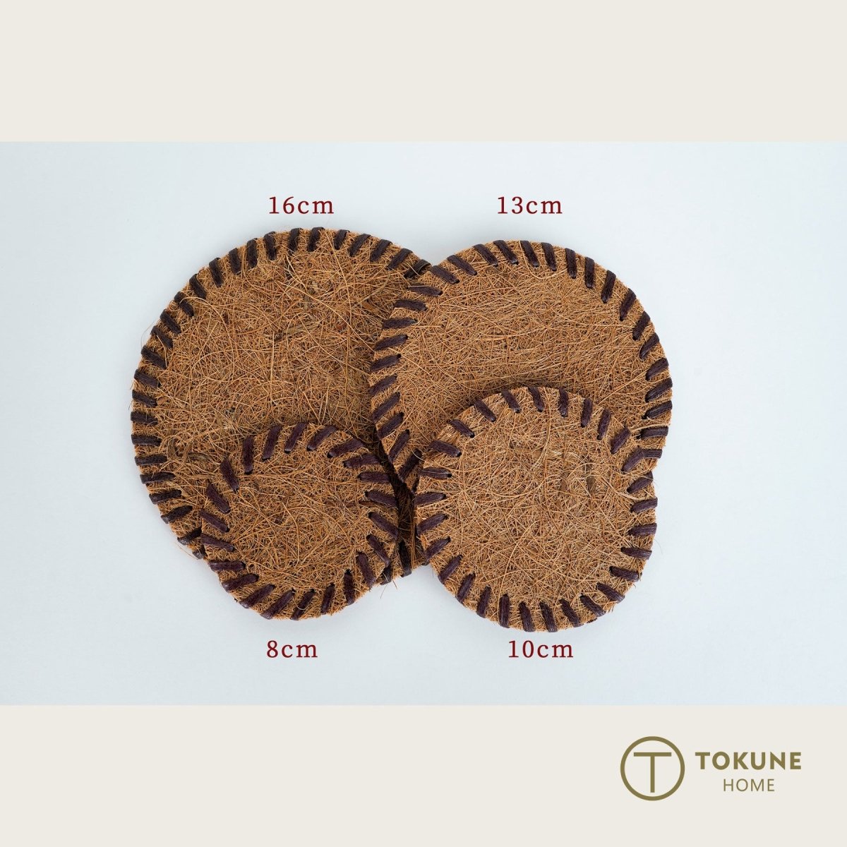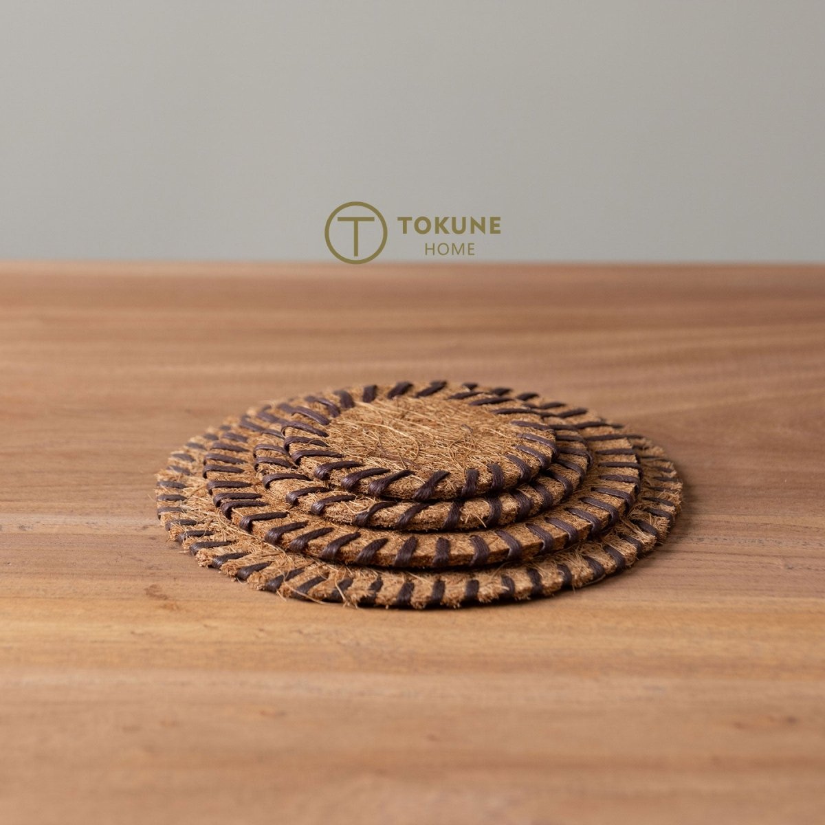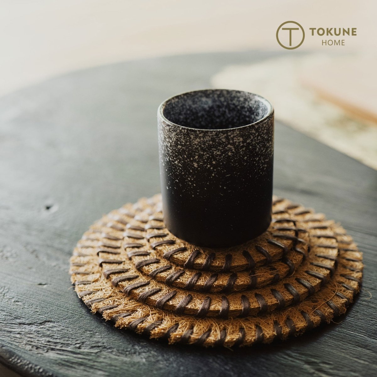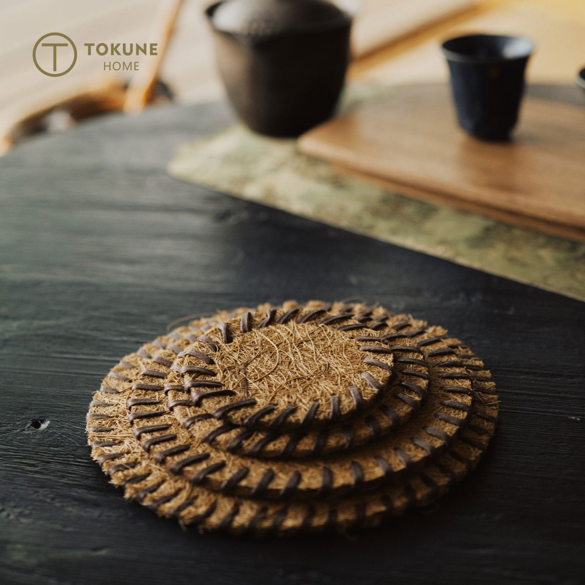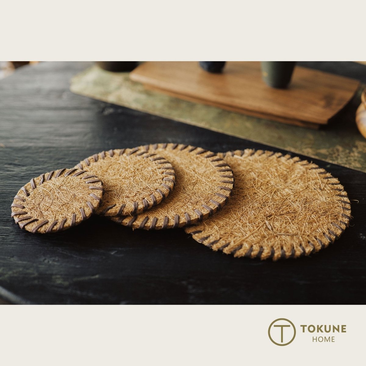 Tokune Home の棕櫚茶杯托4枚セットは、大小異なるサイズが揃っており、湯呑みから急須、ティーカップまで幅広く対応できます。天然素材ならではの優れた吸湿性と耐熱性で、テーブルを熱や水滴からやさしく守ります。和の食卓にも洋のティータイムにも馴染むデザインです。